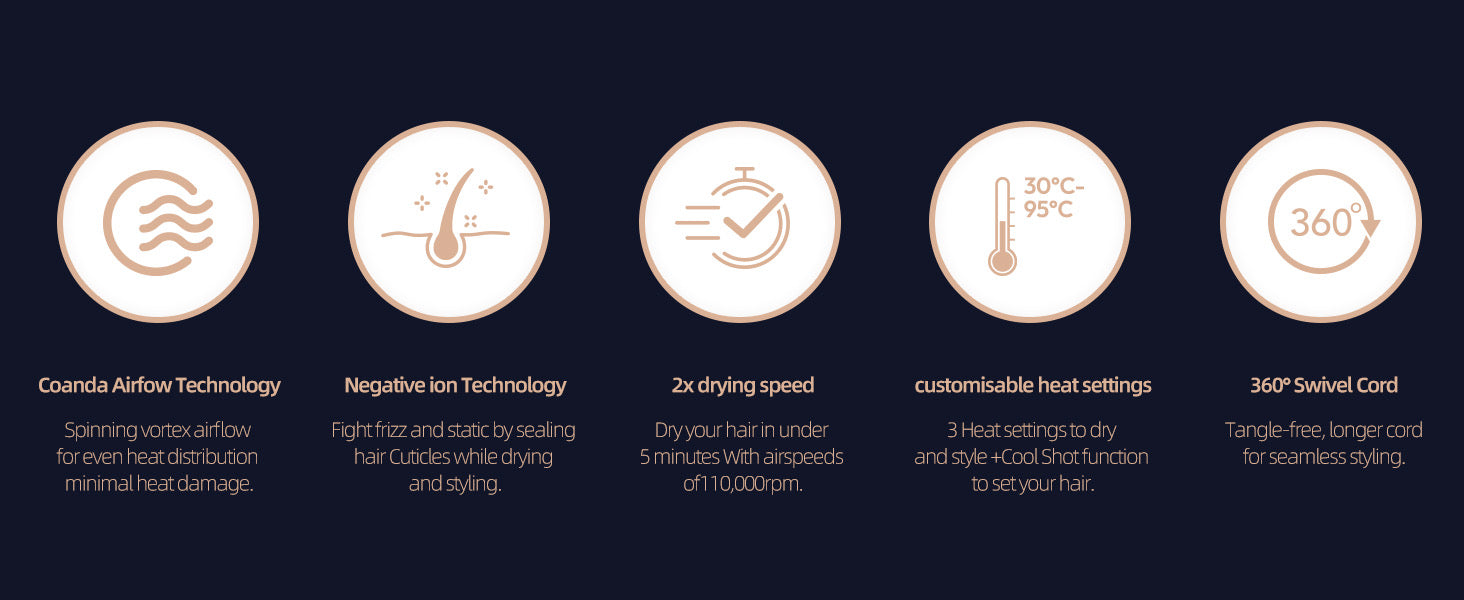 ✨9 Modes & Magnetic Nozzles : The blow dryer for thick/thin hair comes with a 3-level cool air setting and a 3-level hot air setting, that not only dries your hair quickly but also allows you to achieve a variety of hairstyles with magnetic nozzles. Giving you a salon-quality finish every time.